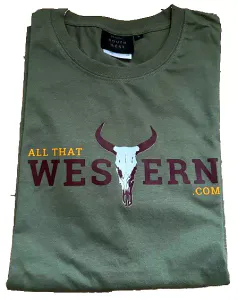 Olivengrønn t-skjorte i 100 % bomull med All That Western-logoen på brystet.