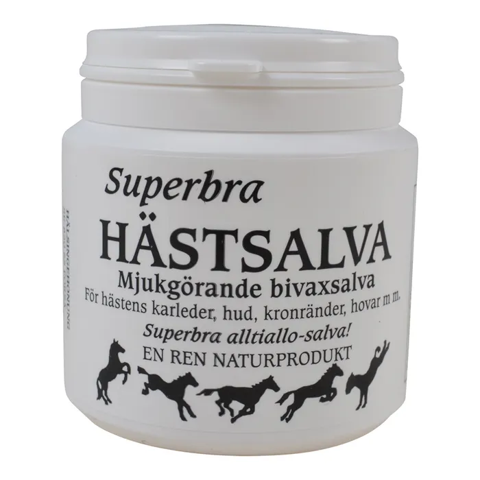 Superbra Hestesalve er en mykgjørende allround-salve som kan brukes på hestens hud, koder, kronrand og til og med på hovene.